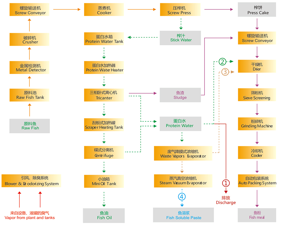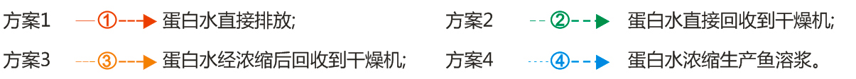 濕法魚粉魚油生產(chǎn)系統(tǒng)對榨汁進行固雜、油水分離后,獲得蛋白水。根據(jù)對分離機出來的蛋白水所采取的不同加工工 藝,可以提供4種不同的魚粉生產(chǎn)線配套方案。