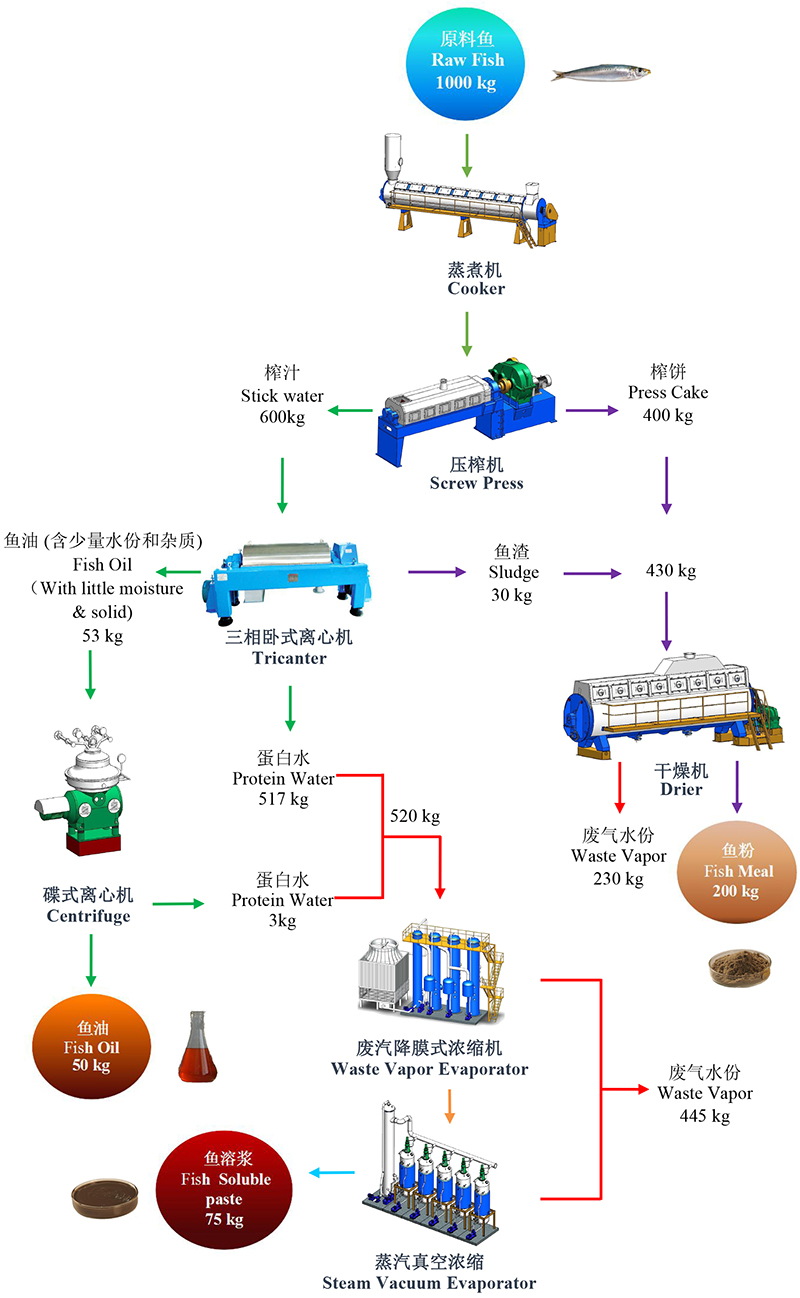 我們可以根據(jù)客戶的投資規(guī)模,工廠選址,環(huán)保要求等條件,為其選擇更好的工藝方案。現(xiàn)以第4種生產(chǎn)線配套方案為例作簡要介紹,同時(shí)結(jié)合相應(yīng)的工藝流程圖及物料平衡圖,供客戶參考。物料平衡圖中的數(shù)據(jù),尤其是魚油的得率,會(huì)因原料魚種類及其捕獲季節(jié)的不同而有所變化。